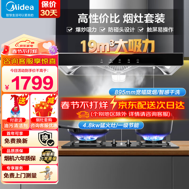 美的(Midea)家用抽油烟机19立方大吸力欧式顶吸油烟机燃气灶具烟灶套装 自清洁 天然气 厨房电器T33A+Q217价格:1799.00元!