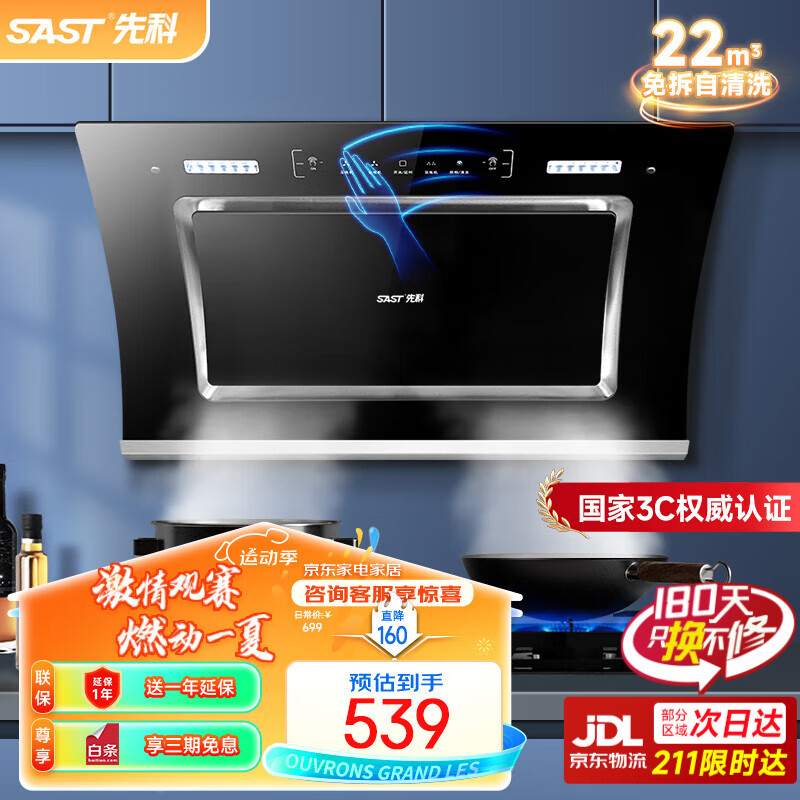 先科(SAST)油烟机侧吸式抽油烟机燃气灶吸油烟机灶具两件套厨房抽烟机家用烟灶套装脱排大吸力小户型低噪静排 上门安装/22立方爆吸+智体感+自清洗价格:699.00元!