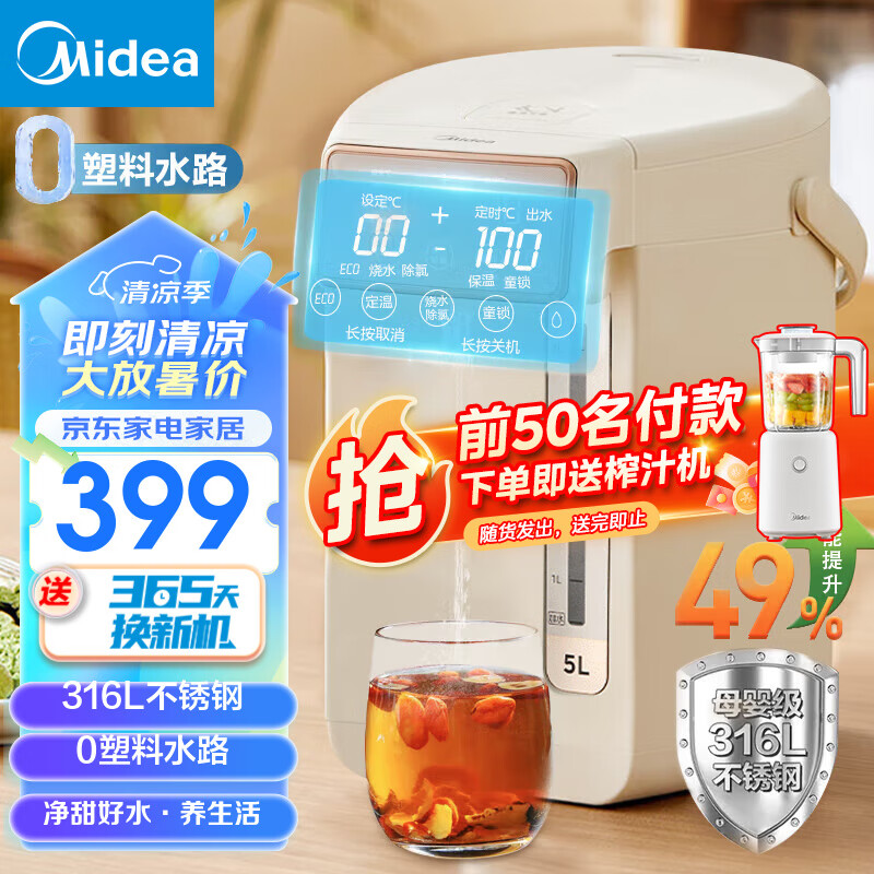 美的(Midea)电热水瓶烧水壶电热水壶恒温水壶5L大容量烧水一体机母婴级不锈钢内胆多段保温非即热式饮水机 升级款316L母婴级内胆0塑料水路 5L价格:539.00元!