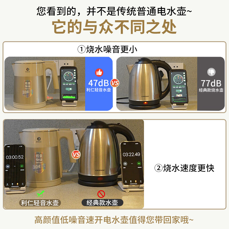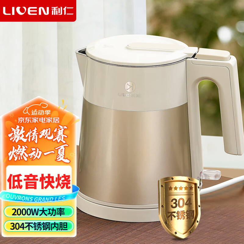 利仁(Liven)轻音电水壶热水壶电热水壶304不锈钢无缝内胆双层防烫烧水壶暖水壶2000W快烧低噪开水壶 JYSH-01价格:132.50元!