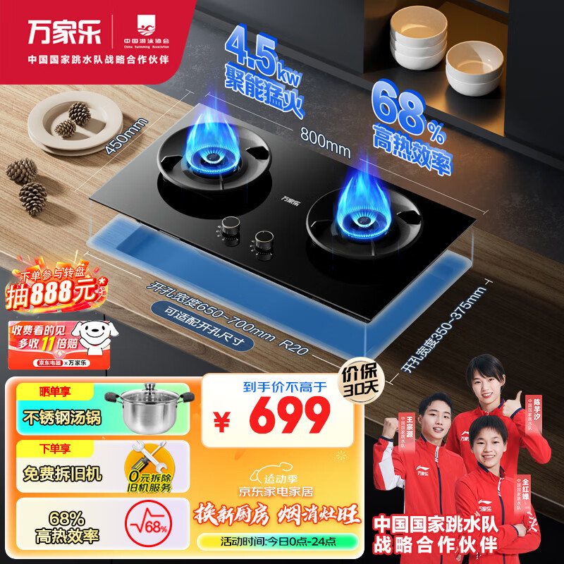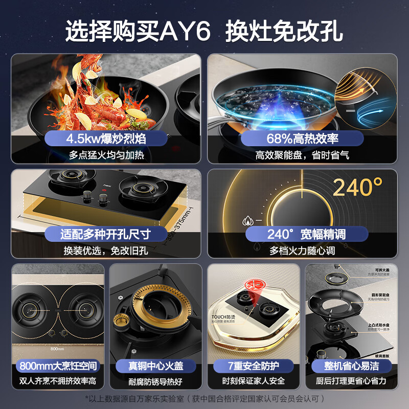 万家乐燃气灶 4.5kw大火力 68%热效率台式嵌入式两用燃气灶双灶 可适配开孔尺寸全进风液化气灶JZY-AY6价格:799.00元!
