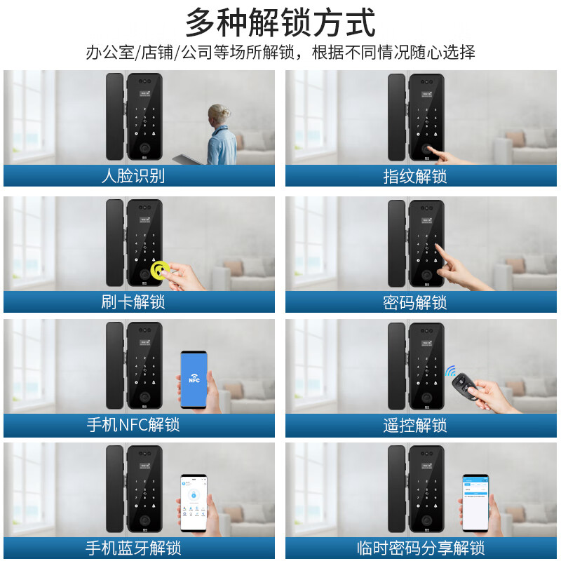开锁方式:APP,NFC,临时密码,密码,人脸识别,手机小程序,刷卡,蓝牙,半导体指纹