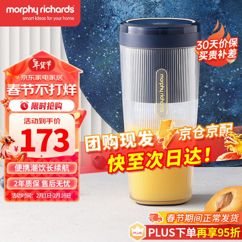 摩飞电器(Morphyrichards)榨汁机 便携式榨汁杯 网红无线充电果汁机 料理机迷你随行杯 MR9800 琉金蓝价格:173.00元!