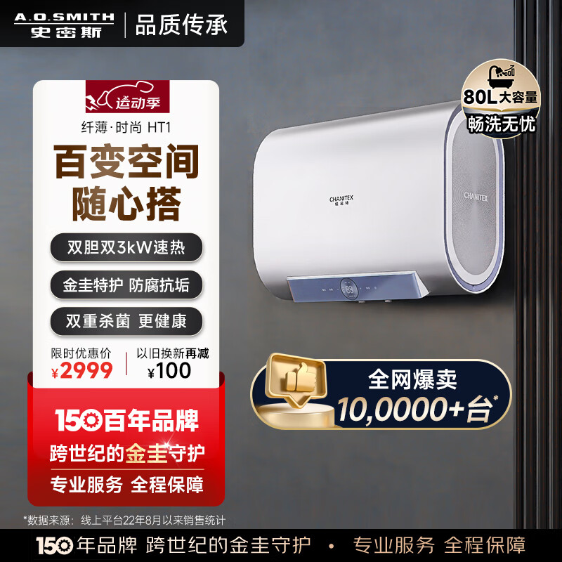 史密斯(A.O.SMITH)佳尼特80升电热水器 超薄双胆扁桶 金圭特护系统 双棒双3kW速热 CTE-80HT1以旧换新价格:2999.00元!