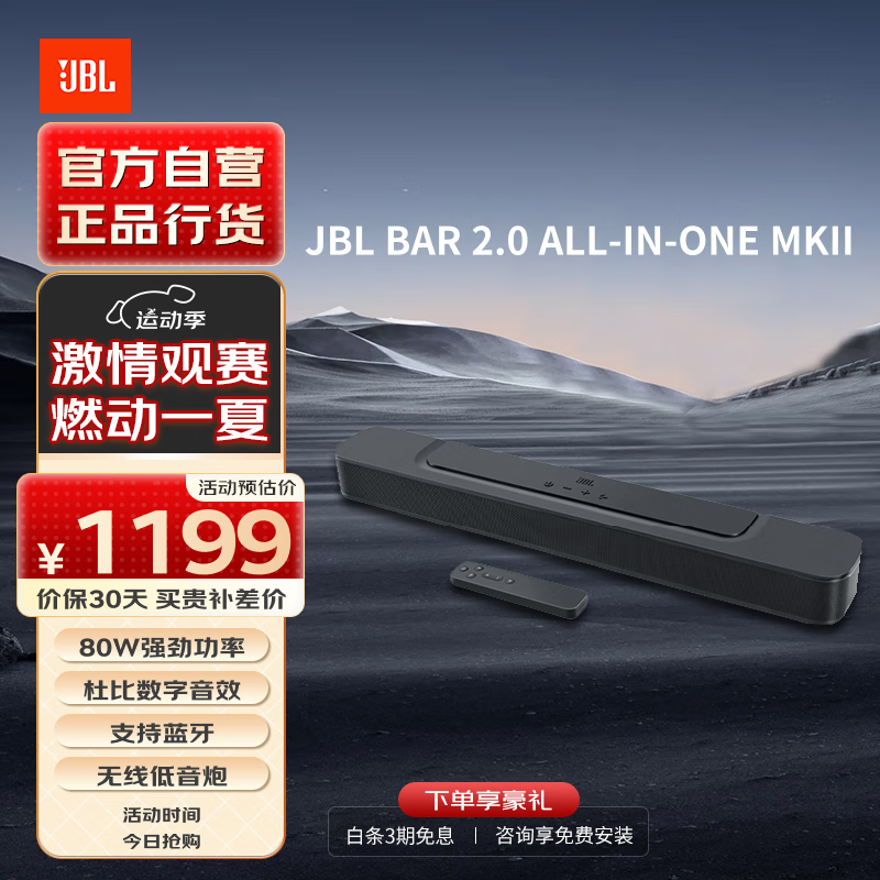 JBL BAR 2.0 ALL-IN-ONE MKII 音响 电视壁挂回音壁 家庭影院 无线蓝牙 杜比音效 客厅音响 条形音箱价格:1299.00元!