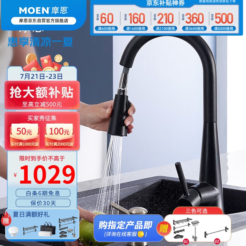 摩恩(MOEN)磨砂黑色防指纹厨房水龙头 抽拉式水槽洗菜盆洗碗盆冷热水龙头价格:1179.00元!