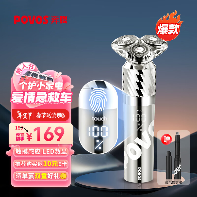 奔腾(POVOS)电动剃须刀男士智能感应刮胡须刀须刨 全身水洗快充PQ9800流光银新年礼物【送男友送老公送父亲】价格:199.00元!
