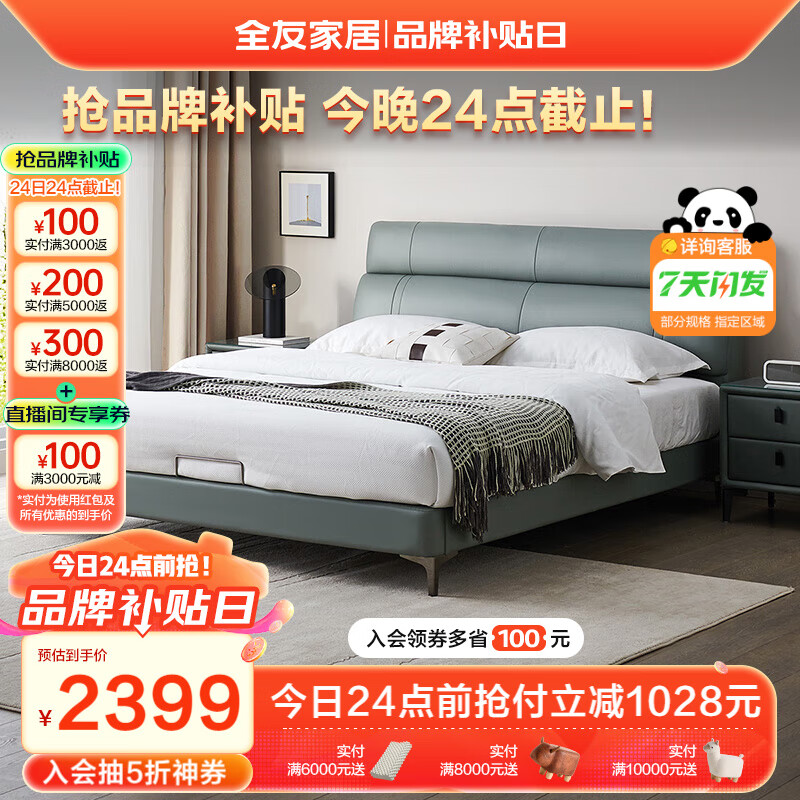 全友家居 真皮艺床 头层牛皮现代简约主卧室双人大床2米2.2米105251价格:3427.14元!