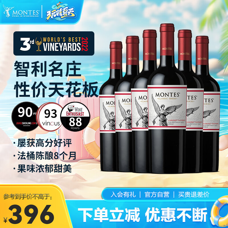 MONTES蒙特斯经典赤霞珠红酒葡萄酒750ml*6整箱日常口粮酒智利原瓶进口价格:396.00元!