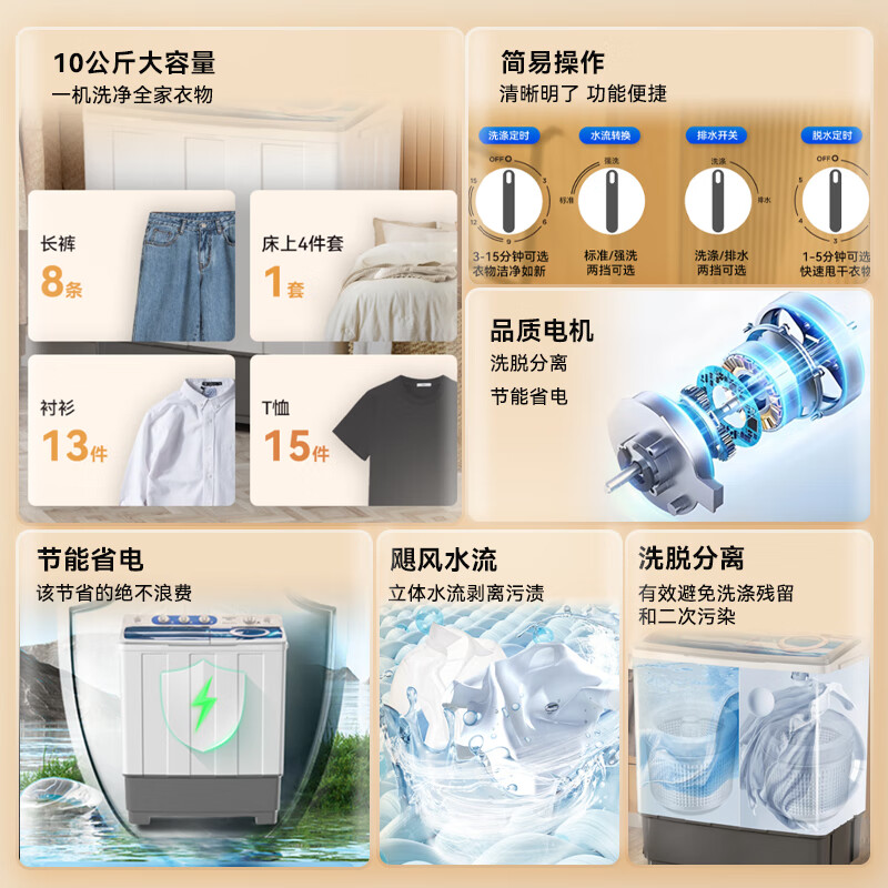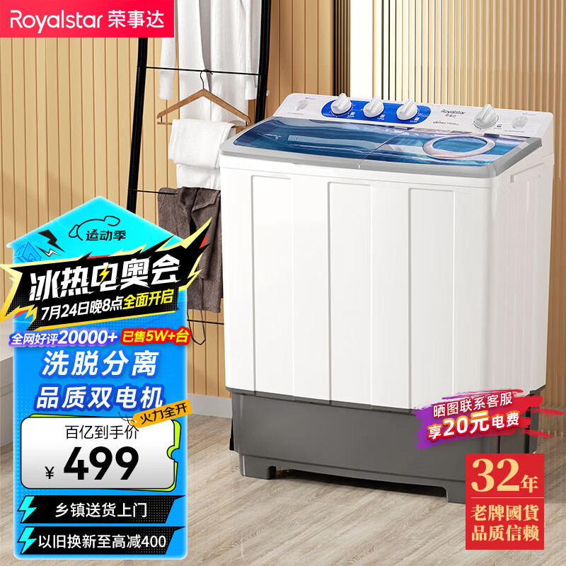 荣事达(Royalstar)洗衣机 10公斤双筒家用双缸半自动双桶洗衣机大容量甩干机 以旧换新 白色 RP10030J价格:509.00元!