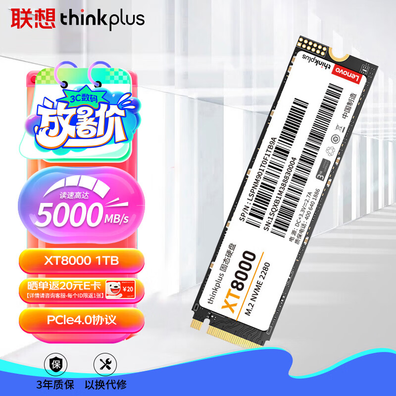 ThinkPlus联想 1TB SSD固态硬盘m.2接口(NVMe协议)pcie4.0 XT8000系列 读速高达5000MB/s价格:509.00元!