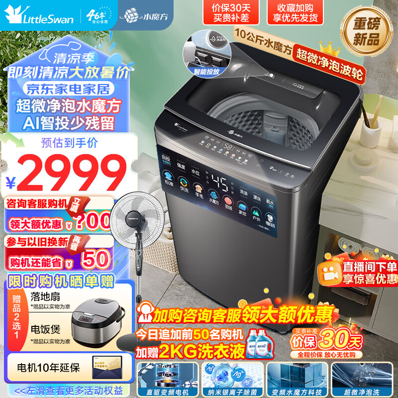 小天鹅(LittleSwan)波轮洗衣机全自动家用 10公斤大容量 水魔方防缠绕 超微净泡洗 直驱变频 炫彩大屏 TB100VC85DT价格:2999.00元!