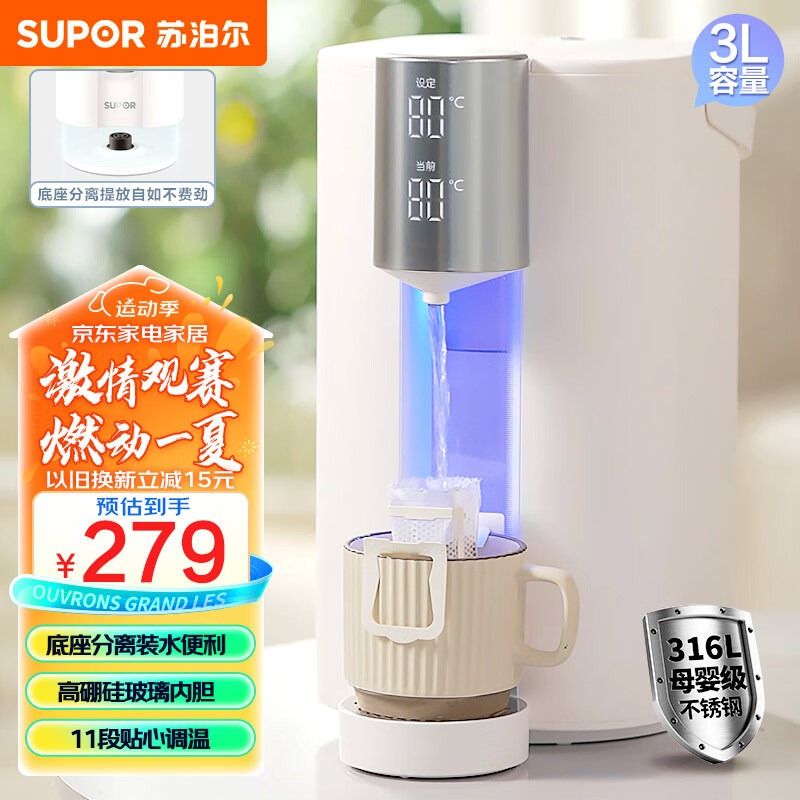 苏泊尔(SUPOR)电热水瓶 除氯电热水壶烧水壶 3L大容量316L不锈钢电水瓶 多段保温恒温电水壶 SW-30T06A价格:279.00元!