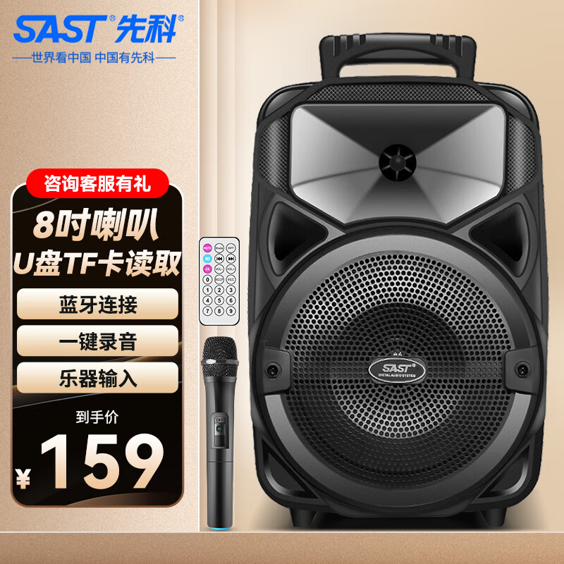 先科A57 8英寸广场舞音响户外大功率移动拉杆音箱无线蓝牙大音量K歌专用便携式单话筒麦克风版价格:169.00元!