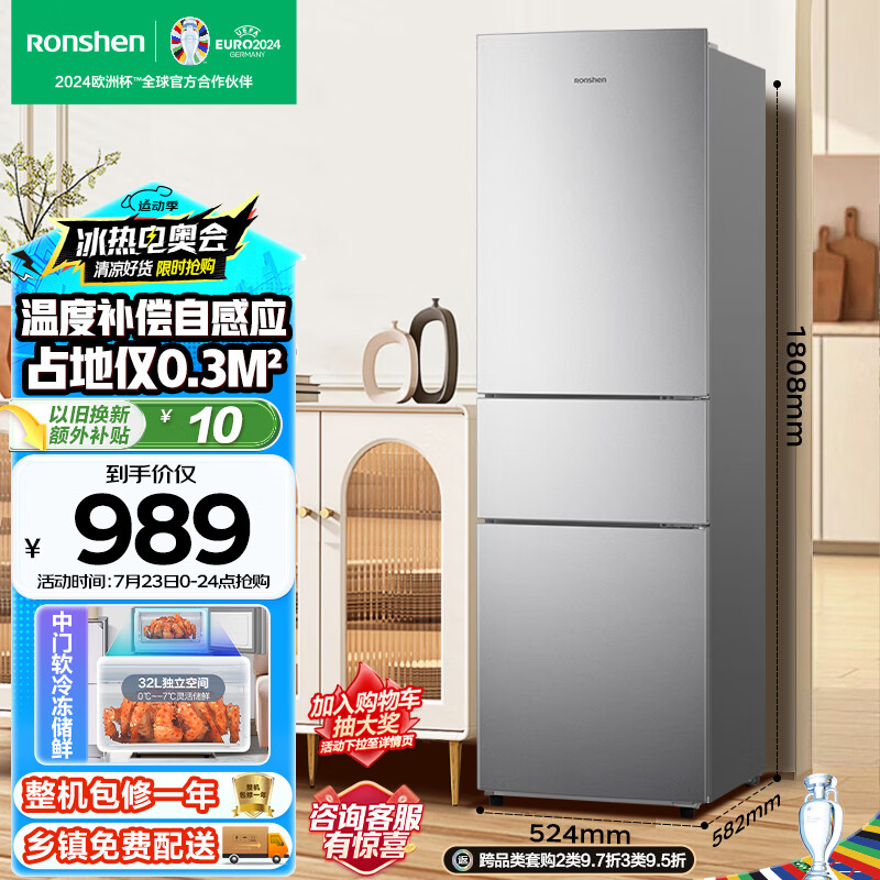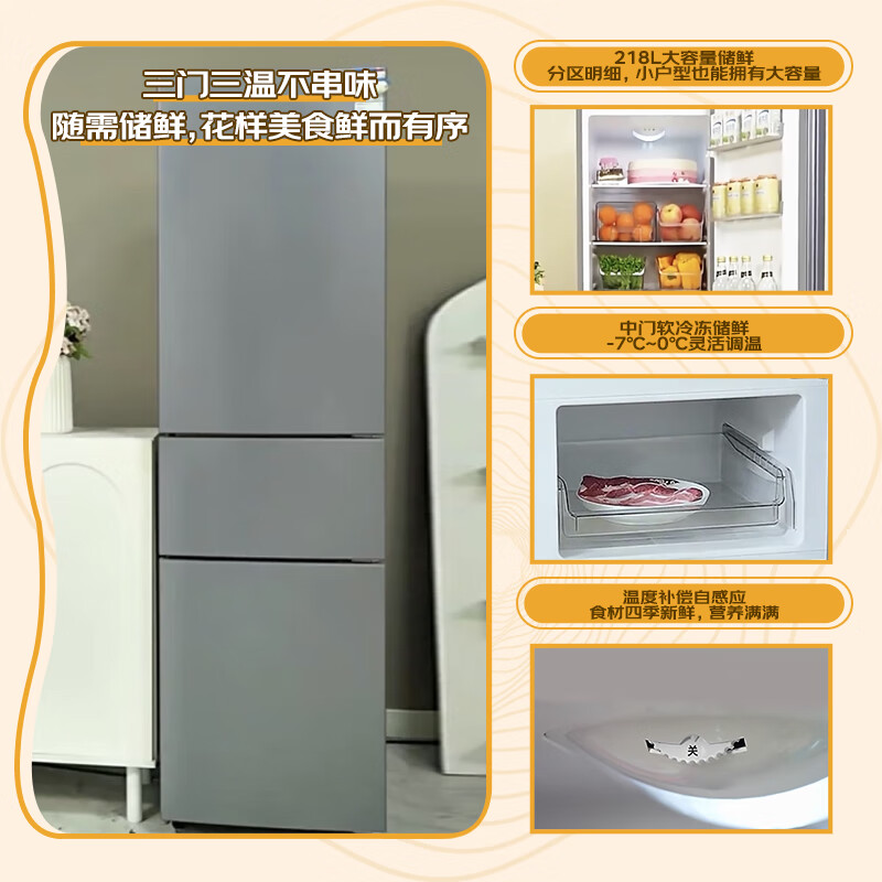 容声(Ronshen)218升三门小型电冰箱银色中门软冷冻三温区保鲜节能省电低噪家用出租房宿舍小巧不占地BCD-218D11N价格:989.00元!