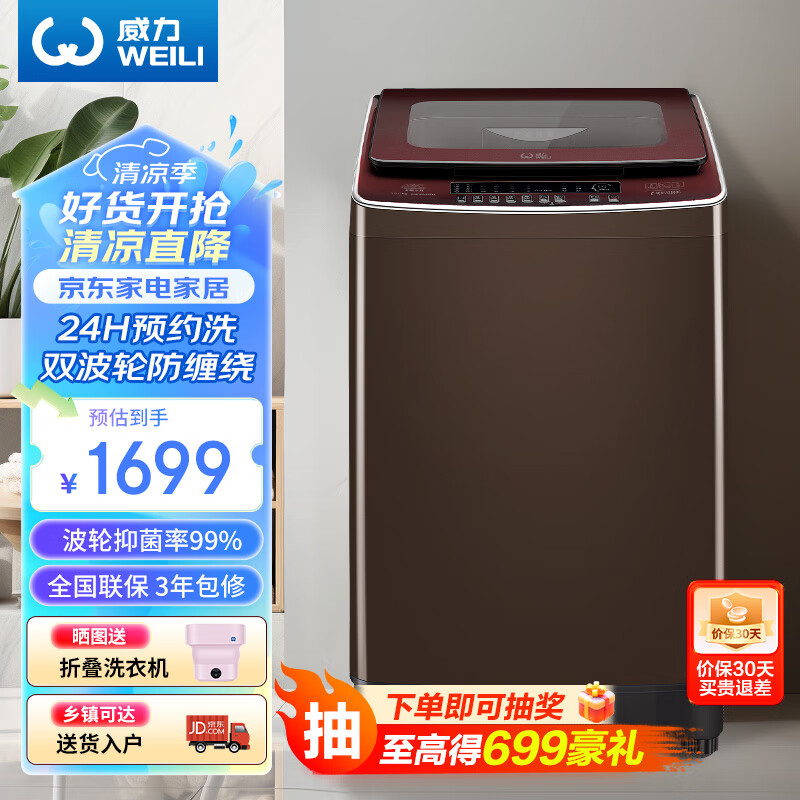 威力(WEILI)波轮洗衣机全自动 10公斤大容量 双波轮防缠绕 阻尼玻璃面盖 自编程24H预约 XQB100-2028T价格:1699.00元!