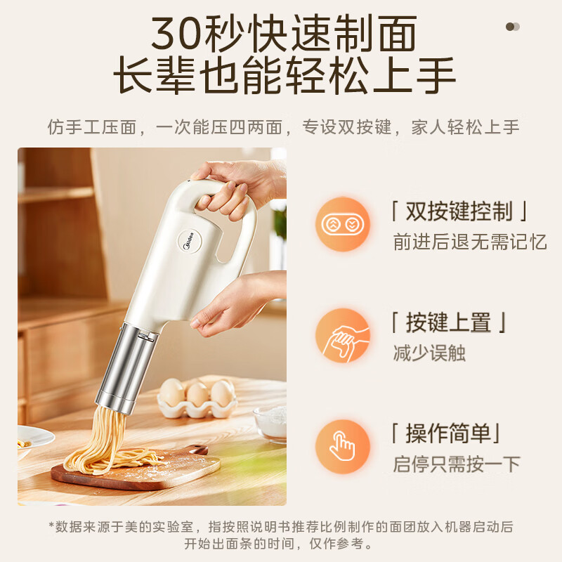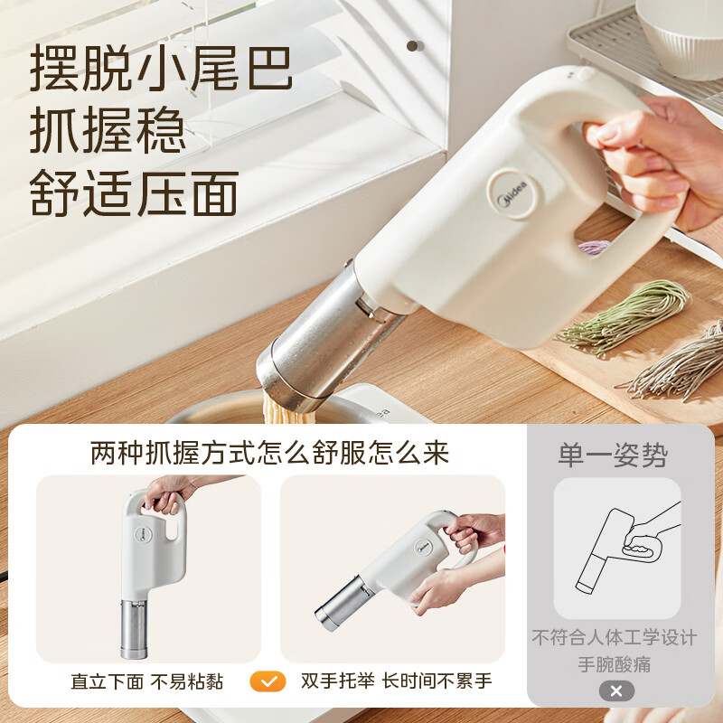 美的(Midea)面条机 压面机家用 手持小型压面枪电动自动不锈钢无线便携面条机饸饹机【配5种出面模具】MJ-GJ23价格:299.00元!
