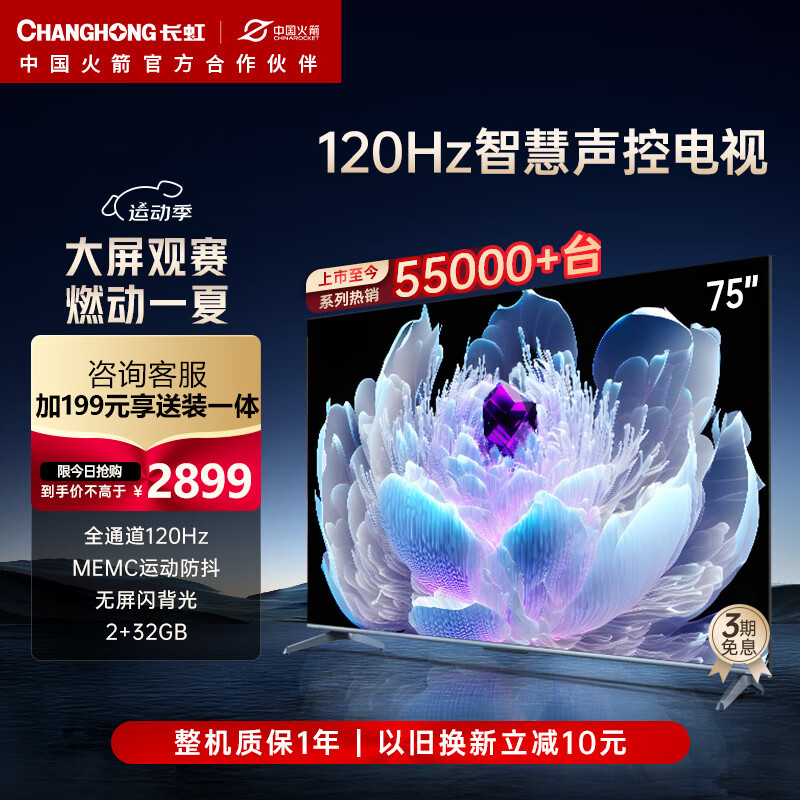 长虹电视75D6 75英寸120Hz高刷免遥控语音杜比视界 2+32GB MEMC四大投屏 4K平板液晶LED电视机以旧换新价格:2899.00元!