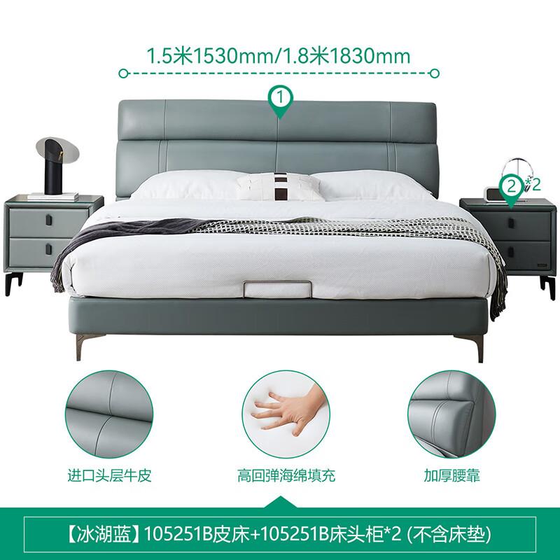 全友家居 真皮床 头层牛皮现代简约主卧室双人皮艺软包大床轻奢105251价格:4370.00元!