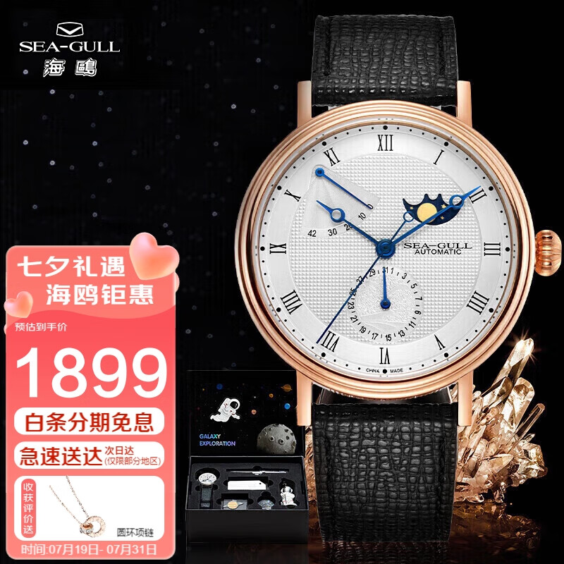 海鸥(SEAGULL)手表男士自动机械表 男表送男友礼物 月相腕表文创礼盒(白金)价格:2179.00元!
