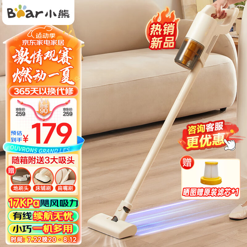 小熊(Bear)吸尘器家用办公室手持有线大吸力强力五重过滤轻量纤薄机身除尘除螨宠物猫毛XCQ-E06F1无水箱版价格:179.00元!