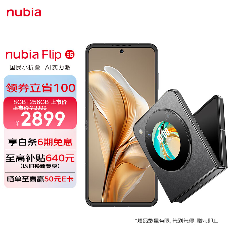 nubia努比亚 Flip 8GB+256GB 焦糖色 高通骁龙芯片 5000万后置双摄 120Hz屏 5G 拍照AI小折叠屏价格:2999.00元!