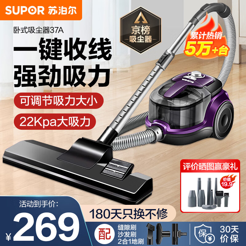 苏泊尔(SUPOR)卧式吸尘器家用大吸力地毯清洁开荒保洁大功率家庭吸尘器小型带一键收线 VCC37A-13价格:299.00元!