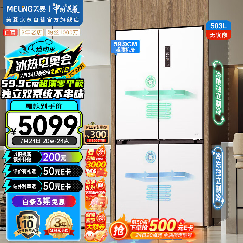 美菱(MeiLing)503升十字双开对开四开门超薄零嵌入式冰箱家用无霜一级变频双系统双循环大容量BCD-503WPU9CZX白价格:5599.00元!