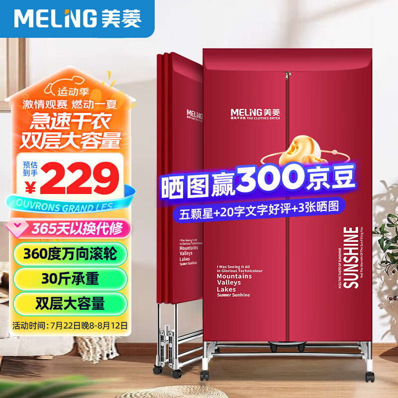 美菱(MeiLing)干衣机烘干机 折叠烘衣机衣柜式风干机 家用小型婴儿衣物暖风机宿舍30斤大容量折叠干衣机 MD-19价格:249.00元!