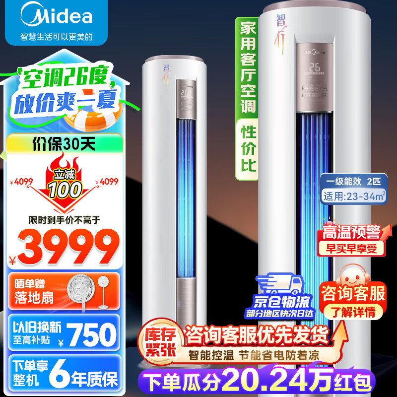 美的(Midea)空调柜机 智行三代 2匹新能效智能变频冷暖 节能省电 客厅家用圆柱立式KFR-51LW/BDN8Y-YA400(3)A价格:3999.00元!