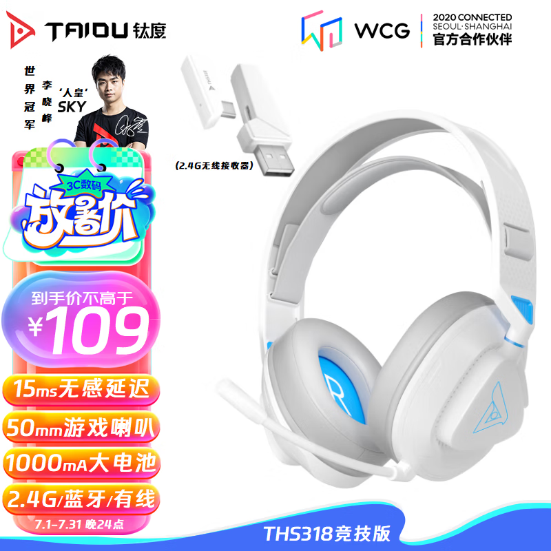 钛度(Taidu)THS318轻鸾竞技版 2.4G真无线蓝牙游戏耳机头戴式手机轻量化电竞三模耳机台式电脑耳麦 无光版白蓝价格:109.00元!