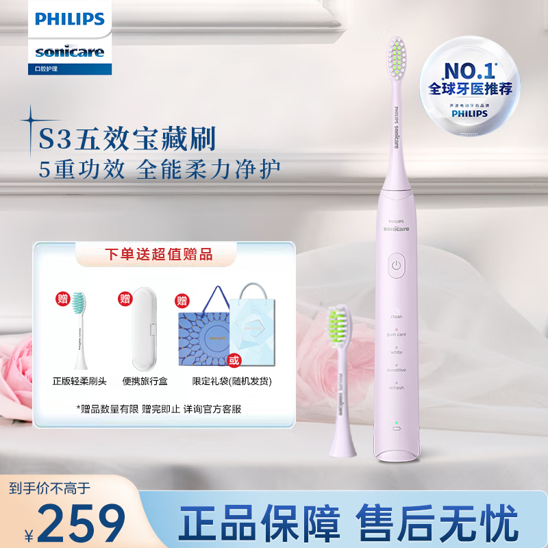 飞利浦(PHILIPS)电动牙刷S3成人 情侣款七夕礼物送男/女友礼物 软毛柔和亮白刷头5效宝藏刷 绝绝紫HX2471/02价格:309.00元!