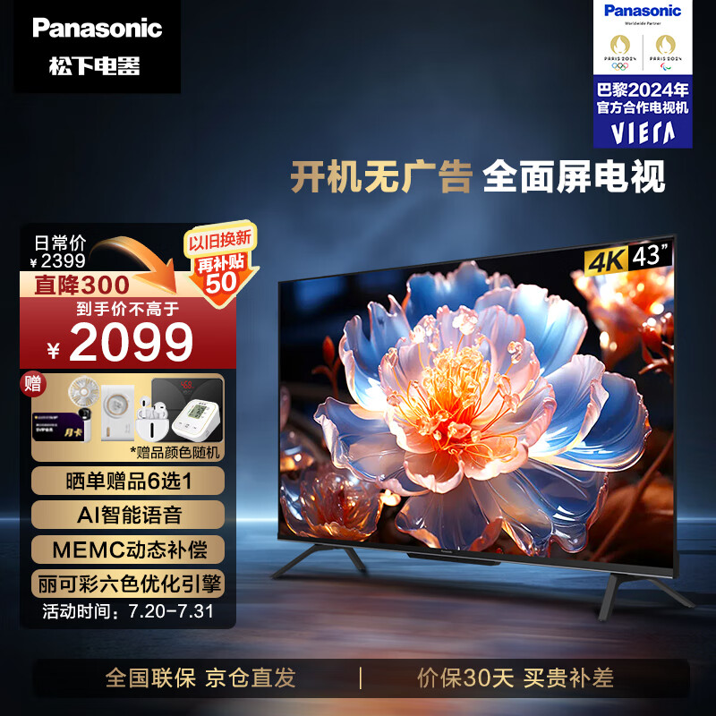 松下(Panasonic)电视LX580 43英寸 丽可彩4K 屏MEMC AI智能语音 开机无广告电视机 TH-43LX580C价格:2099.00元!