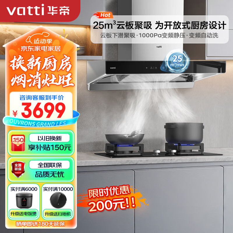华帝(VATTI)欧式跨界三腔抽油烟机家用变频大吸力燃气灶具烟灶套装25风量自动清洗京东小家i11S18套装液化气价格:3899.00元!