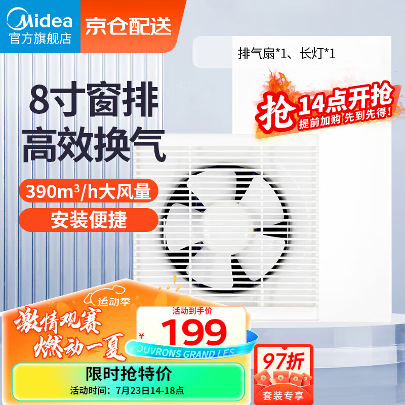 美的(Midea)窗式排气扇换气扇卫生间厨房墙用排风扇8寸抽风机价格:199.00元!