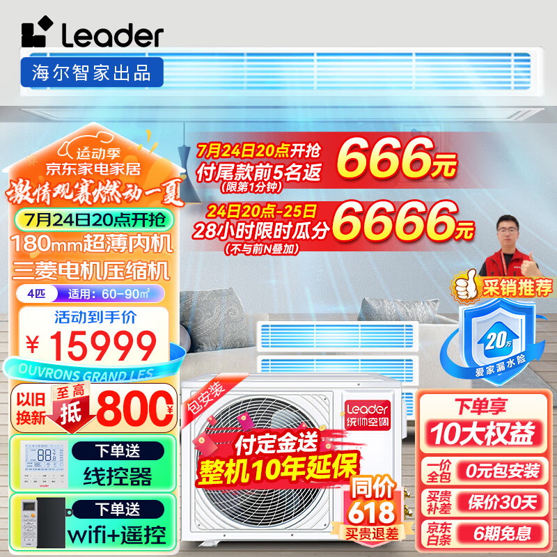 Leader海尔智家出品中央空调一拖三 风管机四匹嵌入式全屋空调4P多联机全直流变频一级能效RFC100STSJVA价格:15999.00元!