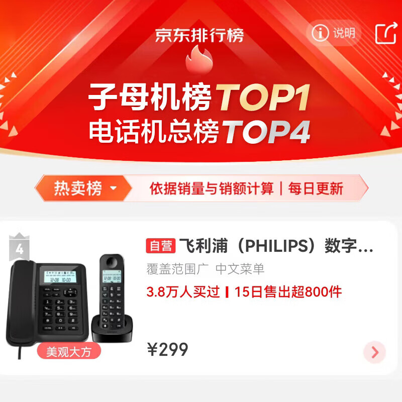 飞利浦(PHILIPS)数字无绳电话机 无线座机 子母机 办公家用 信号覆盖广 屏幕白色背光 DCTG167一拖一黑色价格:289.00元!