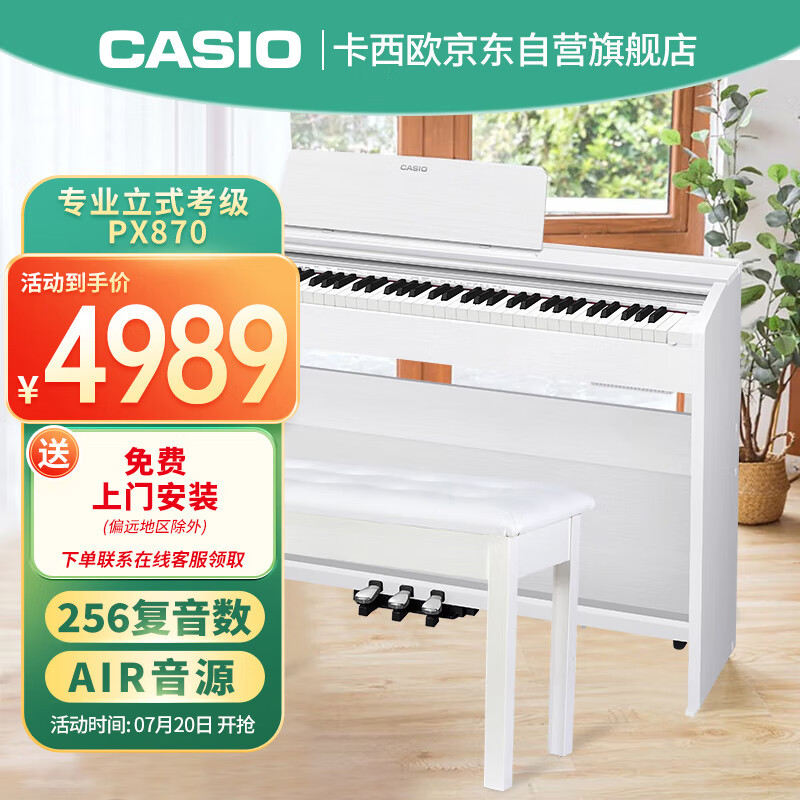 卡西欧(CASIO)电钢琴 PX870白色立式成年人儿童88键重锤智能APP互动分享+琴凳价格:4999.00元!
