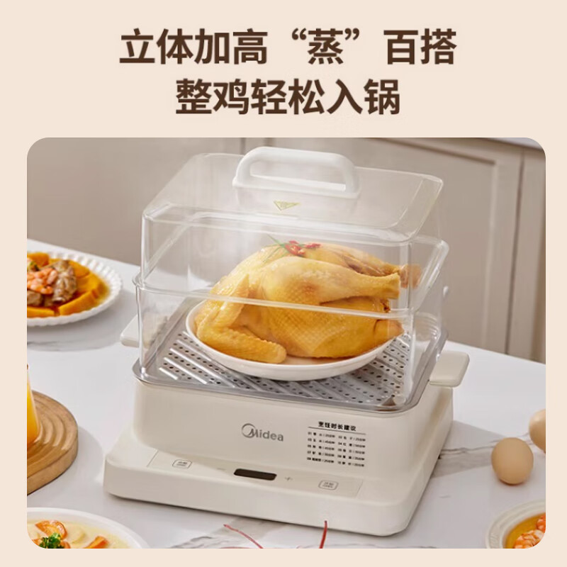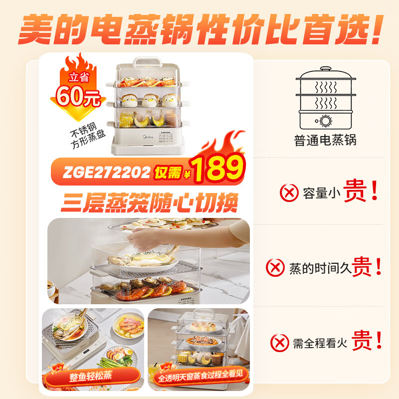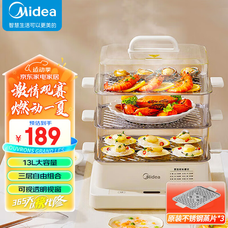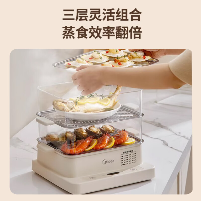 美的(Midea)电蒸锅 三层13L大容量电蒸箱 家用蒸箱 蒸汽锅多用途锅多功能蒸包子锅全透明视窗 MZ-ZGE272202价格:189.00元!