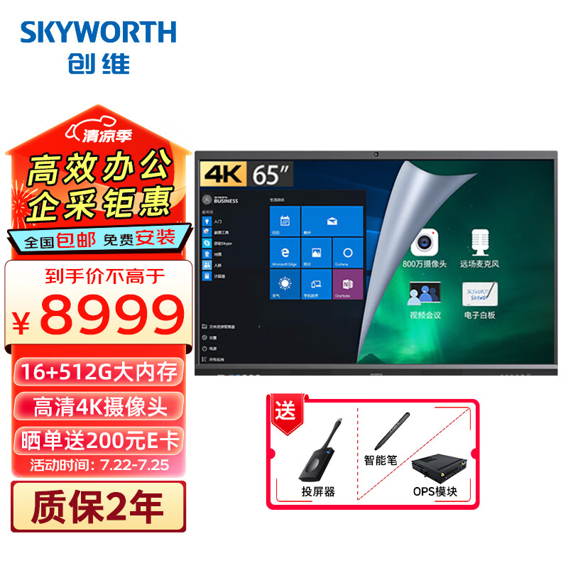 创维(Skyworth)会议平板65英寸智能触摸一体机电子白板无线传屏会议电视8阵列麦克风65MBK7双系统投屏商用显示价格:8999.00元!