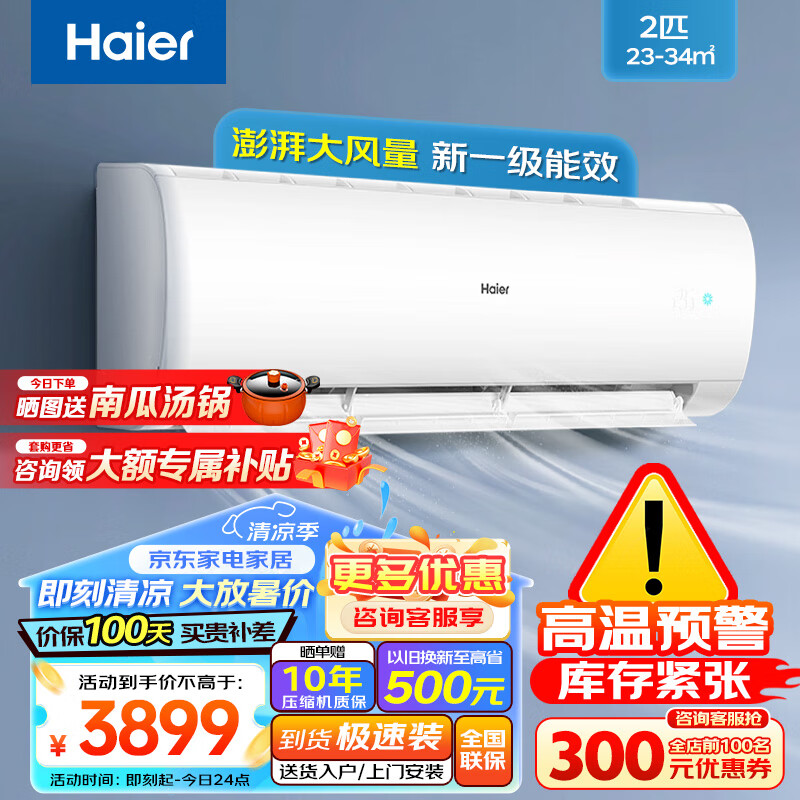 海尔(Haier)新一级能效2匹变频空调 WiFi智控快速冷暖自清洁 客厅家用卧室 壁挂式空调挂机防直吹 以旧换新价格:3899.00元!