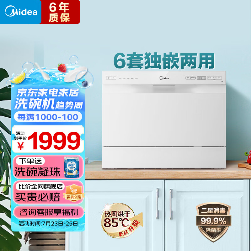 美的(Midea)洗碗机台式M30 小型刷碗机 85℃热风强烘干 二星消毒 台嵌两用 6套大容量价格:1999.00元!