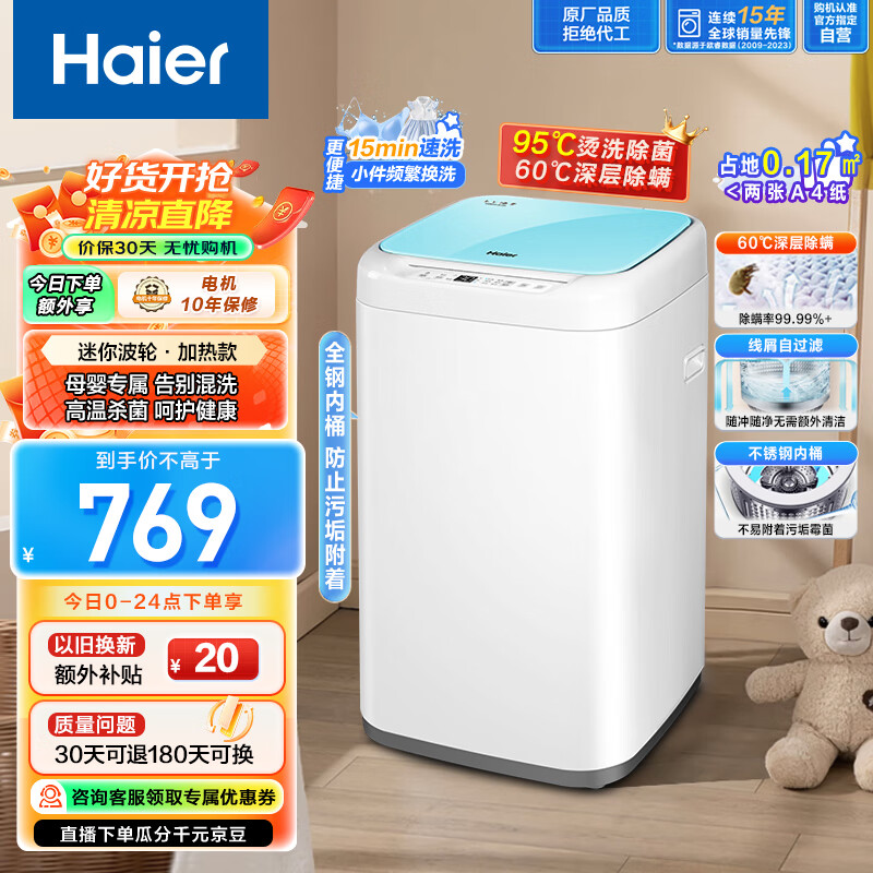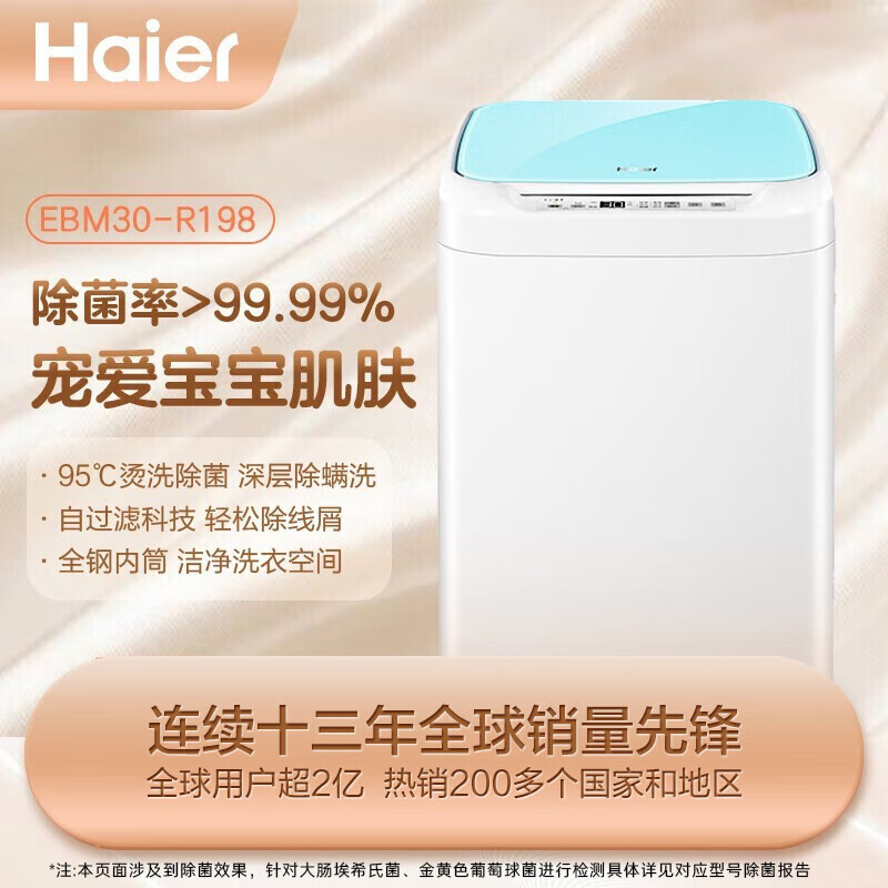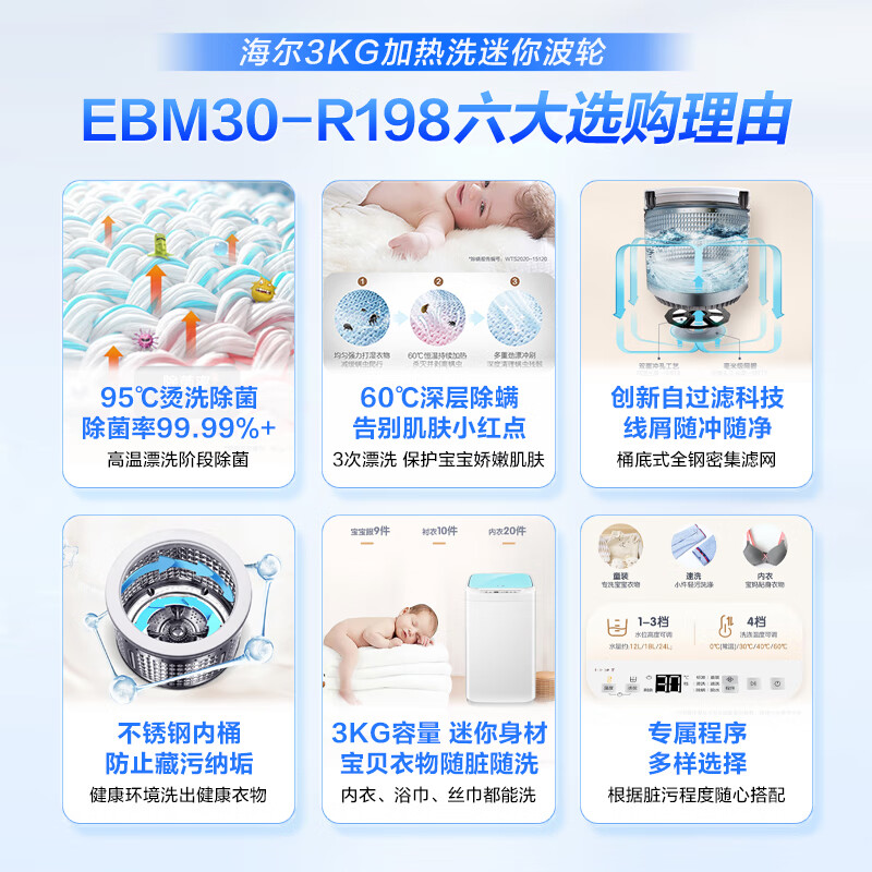 海尔(Haier)波轮洗衣机全自动小型 95℃高温煮洗 3公斤迷你 婴儿洗衣机 儿童内衣洗衣机 小巧机身EBM30-R198价格:769.00元!