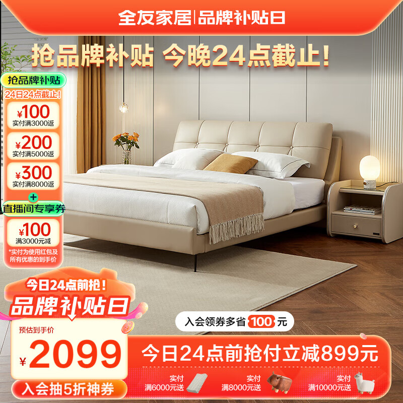 全友家居 真皮艺双人床1.8x2米现代简约主卧室头层牛皮软包大床105135价格:2998.57元!