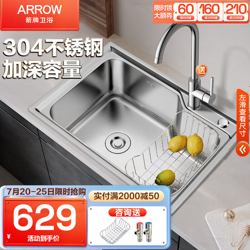 箭牌(ARROW)304不锈钢厨房水槽龙头套装小户型洗菜盆单槽支持台上台下槽安装 B1款 62*44cm+冷热龙头价格:789.00元!