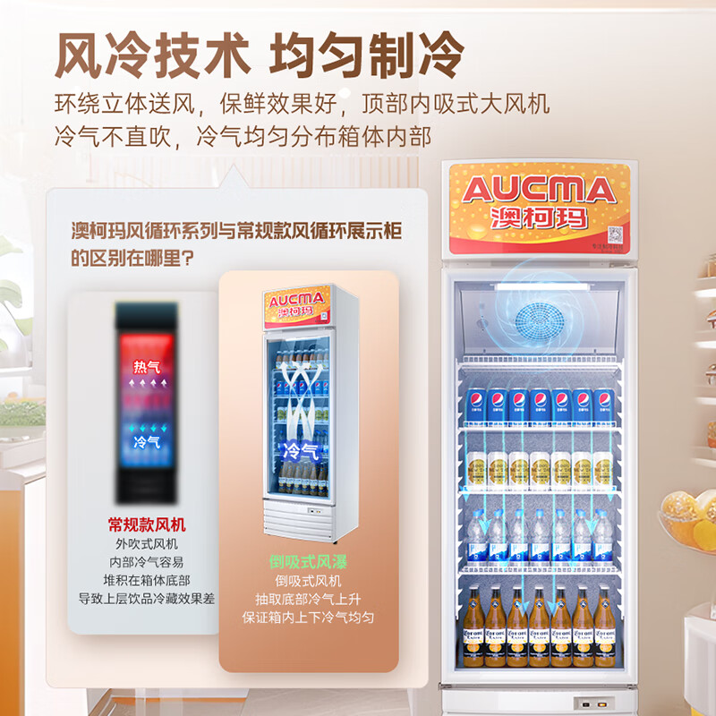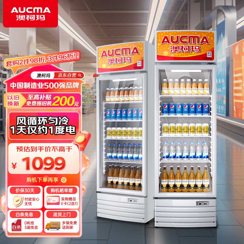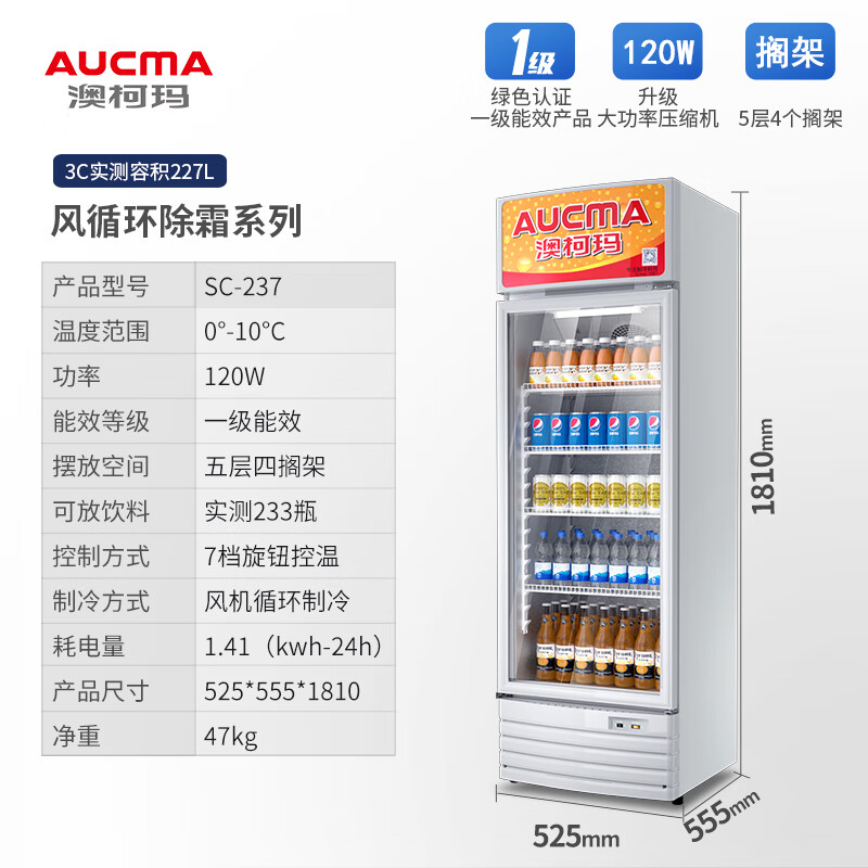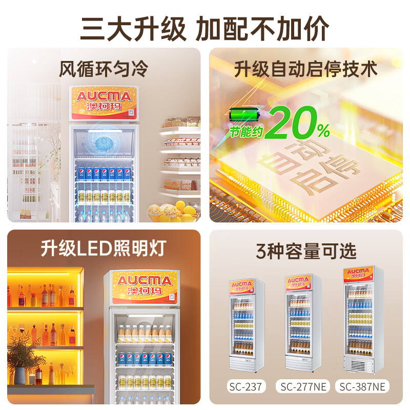 澳柯玛237大容量立式单门商用冷藏展示柜 超市饮料啤酒保鲜冷柜 陈列冰柜冰箱 风循环一级能效 SC-237价格:1199.00元!