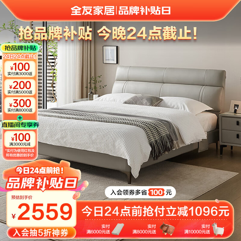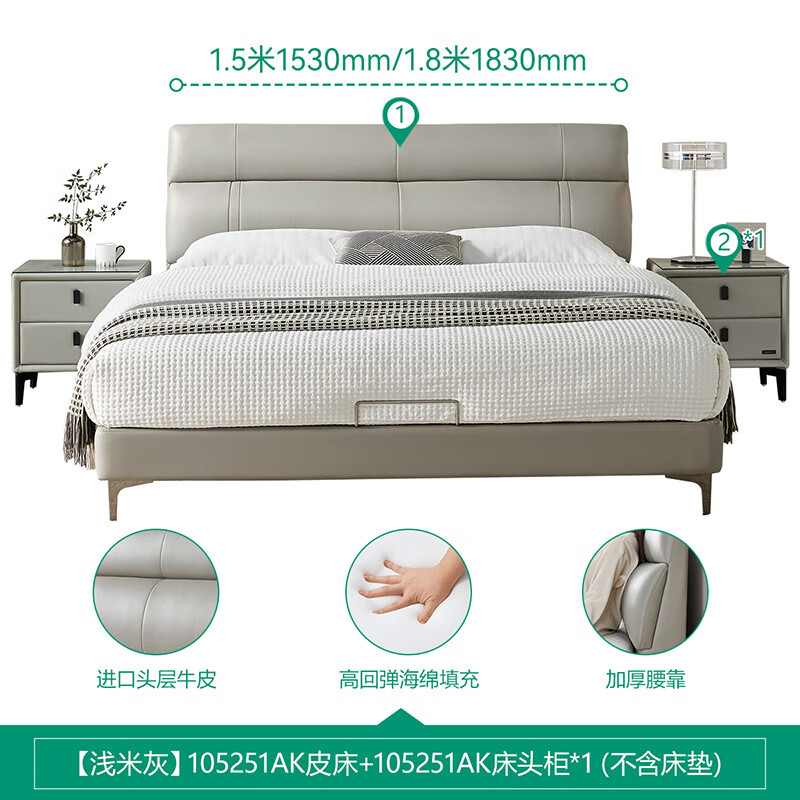 全友家居 真皮床 头层牛皮现代简约主卧室双人皮艺软包大床轻奢105251价格:3655.71元!