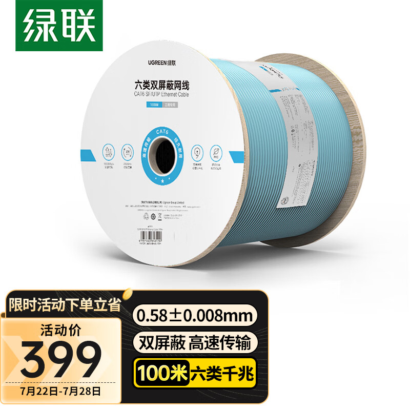 绿联(UGREEN) 六类双屏蔽千兆网线 【0.58±0.008mm纯铜】CAT6类8芯双绞线 网络POE监控工程家装箱线100米价格:429.00元!