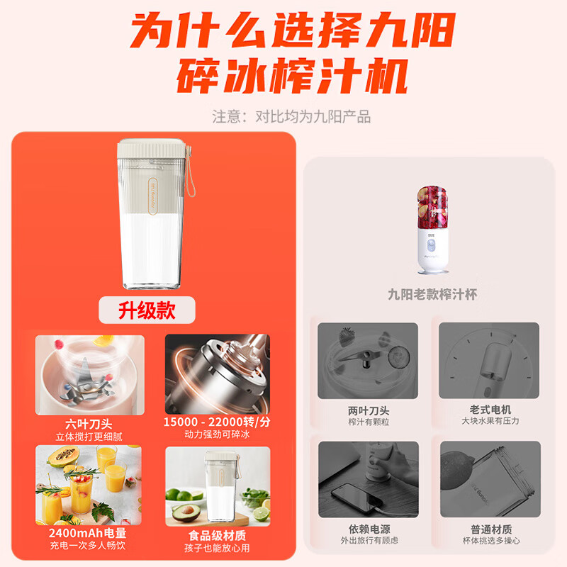 九阳 Joyoung 榨汁机便携式网红充电迷你无线果汁机榨汁杯料理机随行杯L3-LJ2520榛果色价格:99.00元!