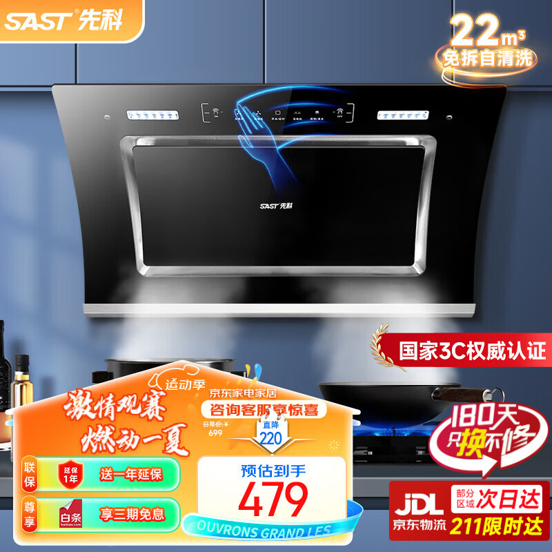 先科(SAST)油烟机侧吸式抽油烟机燃气灶吸油烟机灶具两件套厨房抽烟机家用烟灶套装脱排大吸力小户型低噪静排 不包安装/22立方爆吸+智体感+自清洗价格:699.00元!